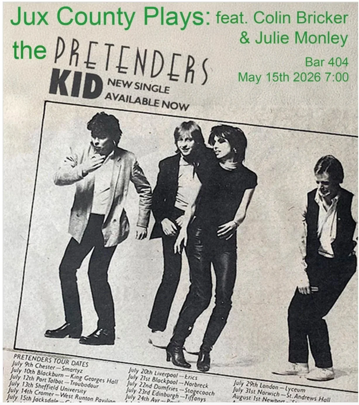 Jux County playing Pretenders | April 12, 2024 7:30 - 9:00pm | BAR 404 @ 404 Broadway | NO COVER